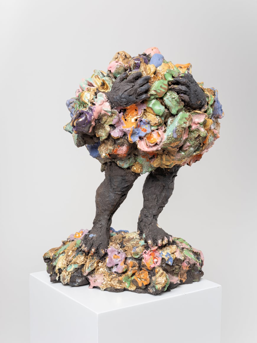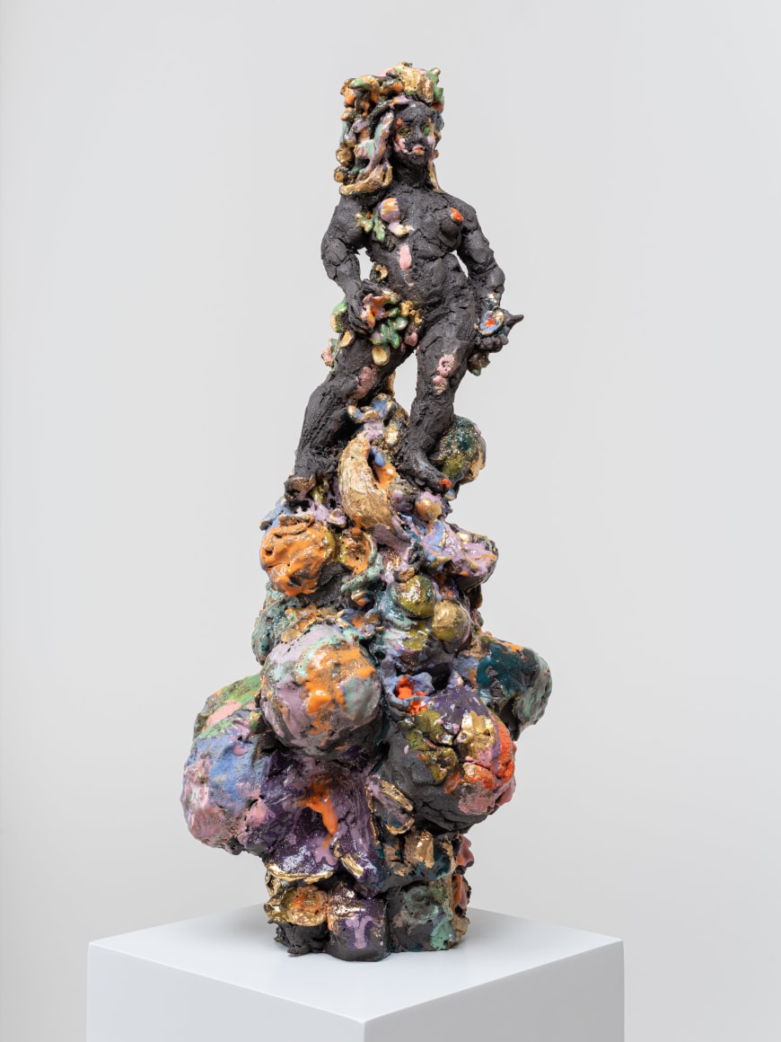 The embellished characters are each unique and expressive, and exuding an air of opulence, mischievousness and confidence. Freed from their previous secondary status, they are seemingly reveling in the spotlight. The chosen medium itself which the artist has consistently worked with for years, also bears a certain significance. Previously largely absent, clay has in recent years enjoyed a remarkable upswing by entering the established gallery spaces. In the light of things, Helle’s work can be seen as an allegory of today’s zeitgeist; the pressing matters of representation, diversity and whose stories are being told.
