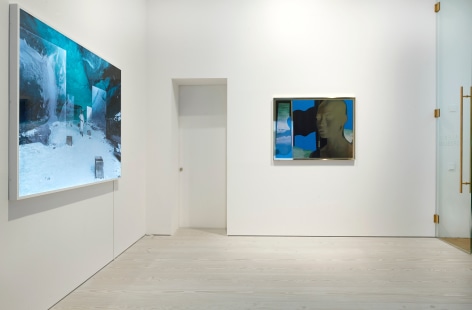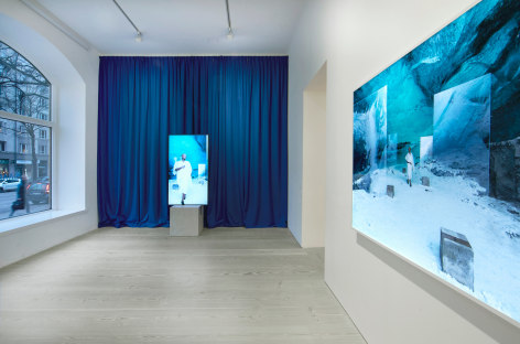 Stones Against Diamonds (2015) is the final body of work presented in the exhibition. The work draws inspiration from a letter written by Brazilian architect Lina Bo Bardi where she praises the beauty of semi-precious gems over precious stones, such as diamonds. Vanessa Myrie, reappears, walking through the sublime scenery of an ice cave in the remote Vatnajökull region on Iceland. In this this new landscape, Julien reflects on how some of the most beautiful objects as the least precious in a conventional sense, especially depicted by the frailness of the ice that melts, representing climate change. Stones Against Diamonds brings back the themes of journey, the natural landscape and the exploration of the unknown, also seen in the previous works.