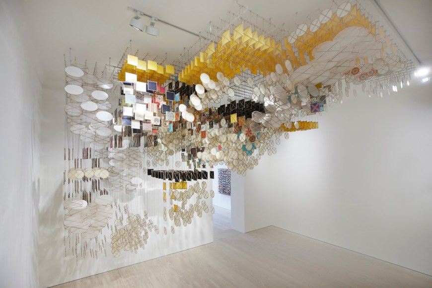 Joining 'The Dark Isn’t The Thing to Worry About' are fourteen newly created wall works, made from thousands of kites arranged in overlapping layers. Within these accretive compositions, larger forms and compositions seem to coalesce or break apart depending on the angle from which the artworks are viewed. In a time of when the world is grappling with the impact of social media data breaches – and the unbridled power found in patterns culled from vast collections of data points – Hashimoto’s recent wall works capture an awe and unease specific to the digital age, as we collectively confront human limitations in the face of endless pixels, data points, and other modular elements from which larger-scale orderings emerge.